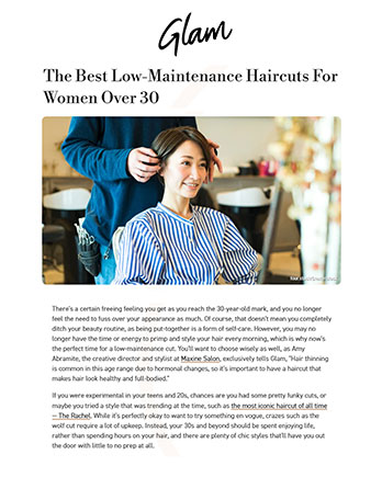 There's a certain freeing feeling you get as you reach the 30-year-old mark, and you no longer feel the need to fuss over your appearance as much. Of course, that doesn't mean you completely ditch your beauty routine, as being put-together is a form of self-care. However, you may no longer have the time or energy to primp and style your hair every morning, which is why now's the perfect time for a low-maintenance cut. You'll want to choose wisely as well, as Amy Abramite, the creative director and stylist at Maxine Salon, exclusively tells Glam, "Hair thinning is common in this age range due to hormonal changes, so it's important to have a haircut that makes hair look healthy and full-bodied."
