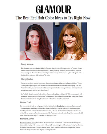 “Cherry Coke red is a rich, brunette red with burgundy and violet undertones,” Brownsell says. “The great thing about this red is that everyone can achieve the color without having to lift your hair too much or even at all.”
