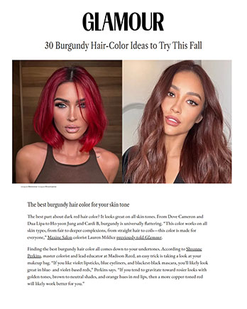 Finding the best burgundy hair color all comes down to your undertones. According to Shvonne Perkins, master colorist and lead educator at Madison Reed, an easy trick is taking a look at your makeup bag. “If you like violet lipsticks, blue eyeliners, and blackest-black mascara, you’ll likely look great in blue- and violet-based reds,” Perkins says. “If you tend to gravitate toward rosier looks with golden tones, brown to neutral shades, and orange hues in red lips, then a more copper-toned red will likely work better for you.”
