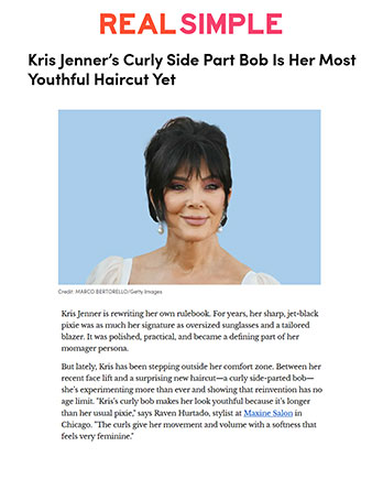 But lately, Kris has been stepping outside her comfort zone. Between her recent face lift and a surprising new haircut—a curly side-parted bob—she’s experimenting more than ever and showing that reinvention has no age limit. "Kris’s curly bob makes her look youthful because it’s longer than her usual pixie," says Raven Hurtado, stylist at Maxine Salon in Chicago. "The curls give her movement and volume with a softness that feels very feminine."
